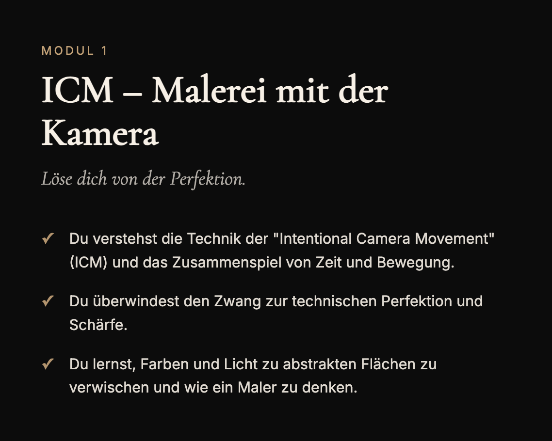 Die meisten Fotokurse erklären Blende und ISO. Das können wir auch. Aber wir können mehr. Wir zeigen dir, wie du mit deiner Kamera Bilder machst, die anders aussehen. Die nicht jeder so machen würde. Die etwas von dir haben.